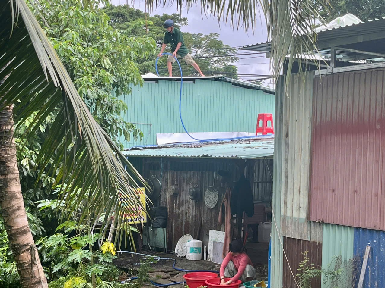 Người dân Vân Canh bơm nước vào túi nhưa giằng mái nhà